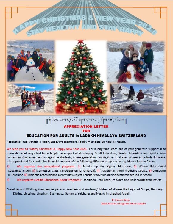 Im vergangenen Jahr fand der Winterunterricht in den Dörfern der Region Senge La mit rund 150 Schülerinnen und Schülern statt. Dank der Spendengelder konnten fünf Lehrpersonen vom Verein Education for Adults zur Verfügung gestellt werden. Die Kinder erhielten schulische Unterstützung in den Fächern Mathematik, Englisch, Hindi, Bothi und Naturwissenschaften. Zum Abschluss wurden Prüfungen abgehalten, die alle Schülerinnen und Schüler erfolgreich bestanden.